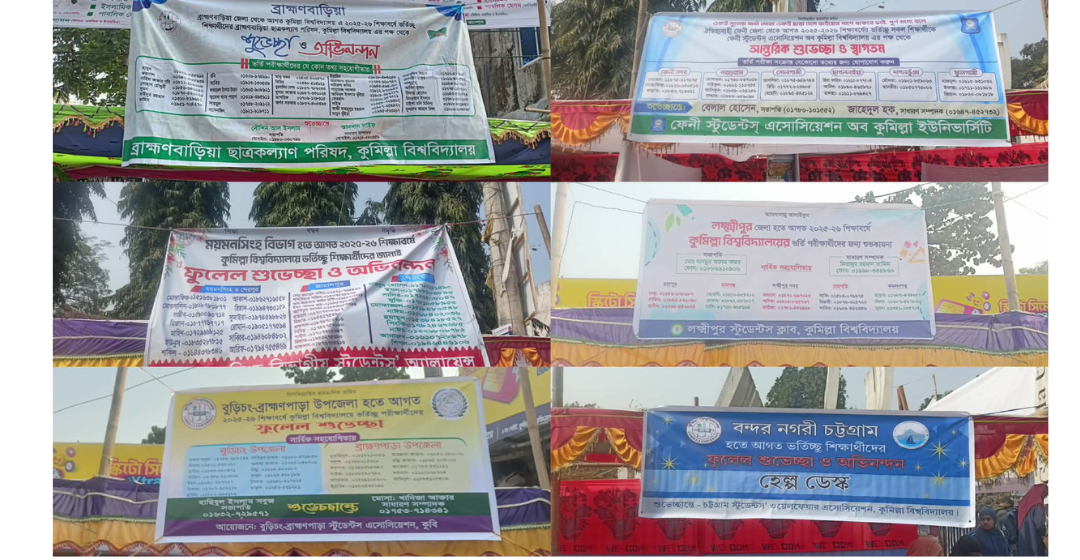 ‎সরেজমিনে দেখা যায়, বিশ্ববিদ্যালয়ের প্রধান ফটকের দুই পাশে বিভিন্ন সহায়তা কেন্দ্র স্থাপন করেছে চট্টগ্রাম স্টুডেন্টস ওয়েলফার এসোসিয়েশন, লক্ষীপুর স্টুডেন্টস ক্লাব, দেবিদ্বার ছাত্রকল্যান পরিষদ, ফেনী স্টুডেন্ট এ্যাসোসিয়েশন, ব্রাহ্মণবাড়িয়া ছাত্রকল্যাণ পরিষদ, বুড়িচং-ব্রাহ্মণপাড়া স্টুডেন্টস এসোসিয়েশন, বৃহত্তর ময়মনসিংহ ছাত্রকল্যাণ পরিষদ, নরসিংদী জেলা ছাত্রকল্যাণ পরিষদসহ আরও বেশ কয়েকটি আঞ্চলিক সংগঠন।