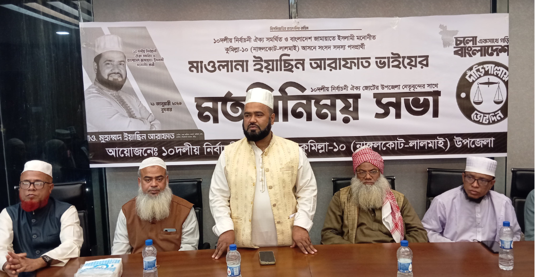১০ দলীয় নির্বাচনী ঐক্য সমর্থিত বাংলাদেশ জামায়াতে ইসলামী মনোনীত কুমিল্লা-১০ (নাঙ্গলকোট-লালমাই) আসনের দাঁড়িপাল্লা প্রতীকের প্রার্থী মাওলানা ইয়াছিন আরাফাতের সাথে ঐক্যবদ্ধ বাংলাদেশ নেতৃবৃন্দের মতবিনিময় সভা বুধবার সন্ধ্যায় স্থানীয় একটি মিলনায়তনে অনুষ্ঠিত হয়েছে। বাংলাদেশ জামায়াতে ইসলামী কুমিল্লা দক্ষিণ জেলা অফিস সম্পাদক সাবেক চেয়ারম্যান সারওয়ার কামালের সভাপতিত্বে সভায় প্রধান অতিথির বক্তব্য রাখেন ইসলামি ছাত্রশিবির সাবেক কেন্দ্রীয় সভাপতি ও জামায়াতে ইসলামী কেন্দ্রীয় মজলিস শুরা সদস্য কুমিল্লা-১০ আসনে দাঁড়িপাল্লা প্রতীকের প্রার্থী মাওলানা মোহাম্মদ ইয়াছিন আরাফাত।